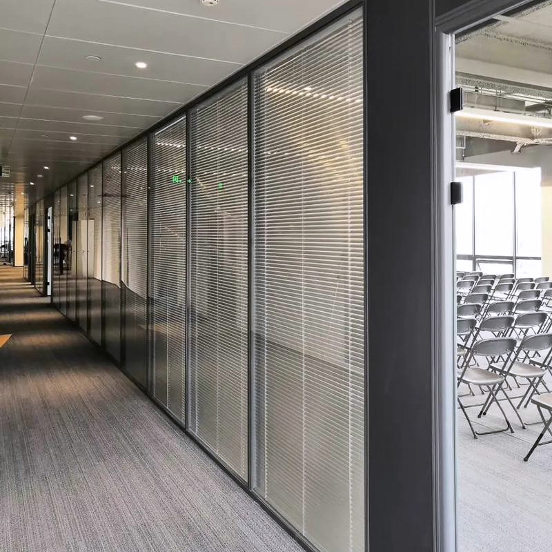 4) Nowoczesna estetyka: Szklane przegrody tworzą nowoczesny, profesjonalny wygląd i napełniają biuro naturalnym światłem, zmniejszając zależność od sztucznego oświetlenia.